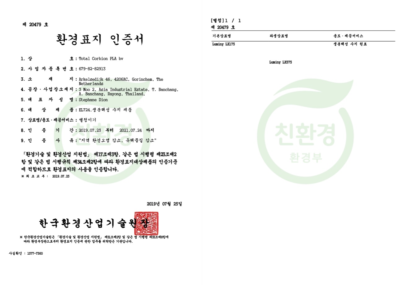 ( Ecopolytech 사와 PLA korea 사의 Textiles 제품의 약자를 표기함.)